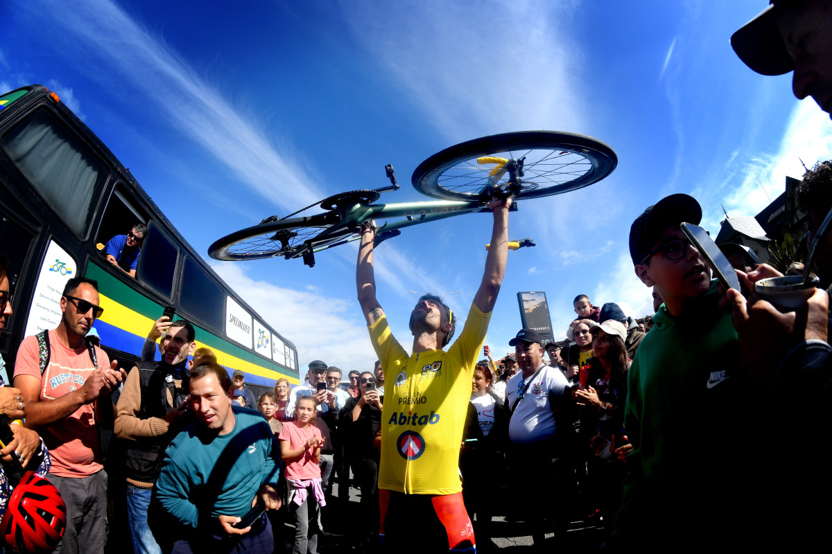 Anderson Maldonado festeja ser el ganador de la Vuelta Ciclista del Uruguay. Foto Estefanía Leal